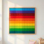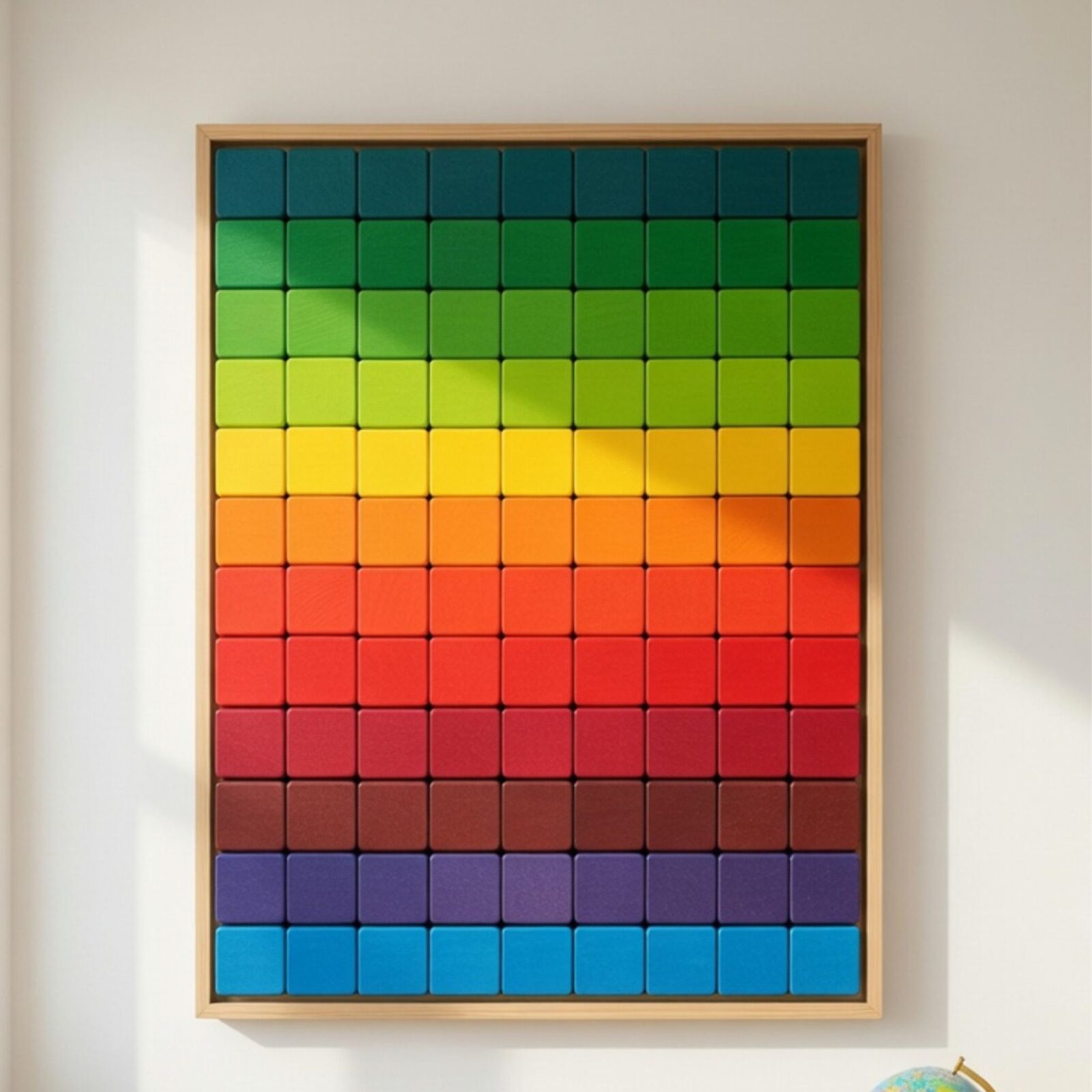 Ignite a passion for art and mathematics with this 100-piece wooden pixel mosaic designed for endless interactive learning. Every individual cube is hand-stained to showcase the natural grain of the wood while providing a saturated, lightfast color finish. Vivid pigments across the 10×10 grid provide a striking visual experience that brightens playrooms, classrooms, or modern offices. Geometric patterns can be reconstructed daily, allowing the user to switch between a classic rainbow arch and complex abstract designs. Meticulous hand-sanding ensures each block is splinter-free and safe for curious hands to grasp, stack, and sort. Modern interior design meets classic childhood play in a product that adapts to the changing needs of a growing household. Horizontal or vertical display options are made possible by the sturdy wooden tray, which can be secured to any wall surface for a permanent installation. Quality craftsmanship ensures this heirloom-style set remains a durable and cherished part of your creative environment for years to come.