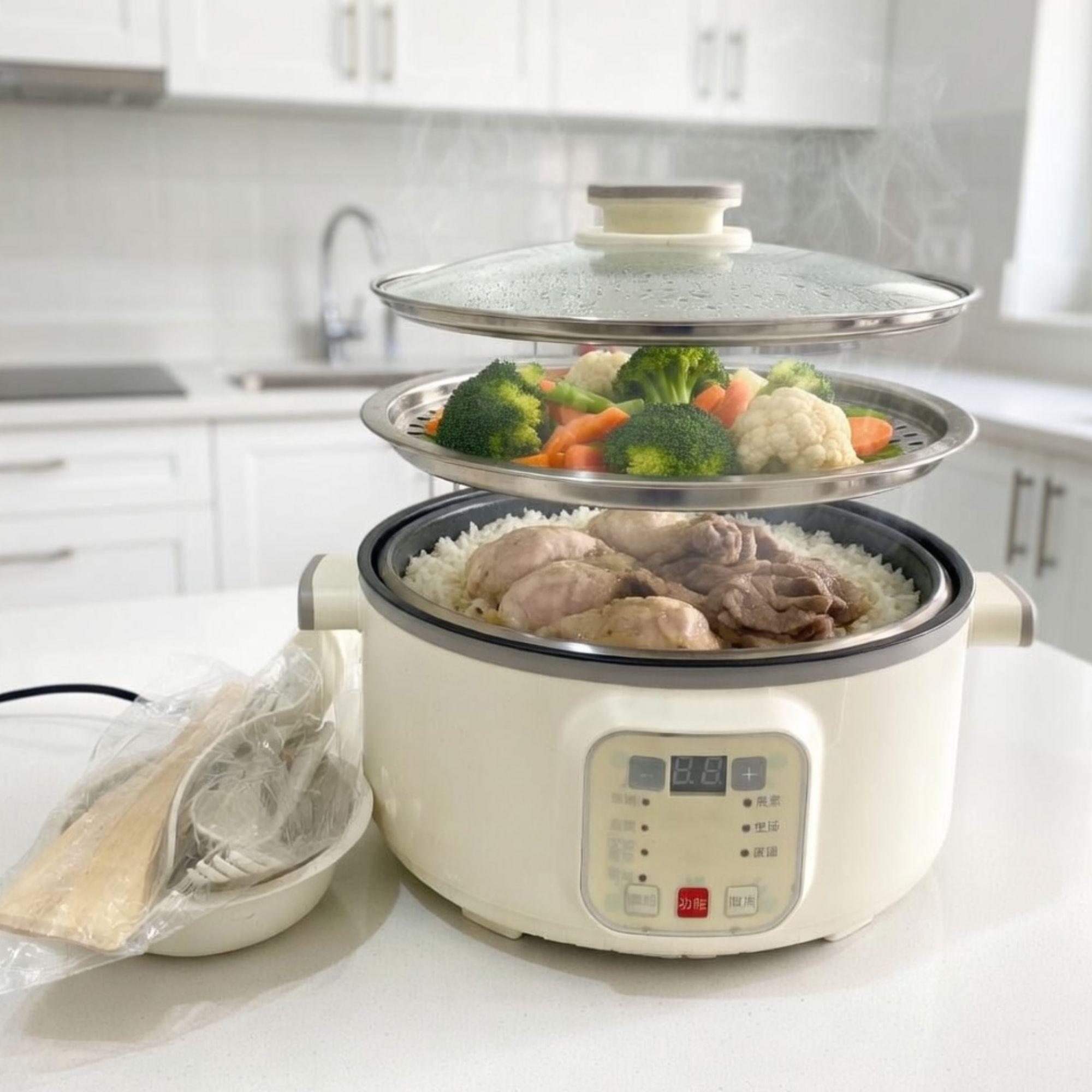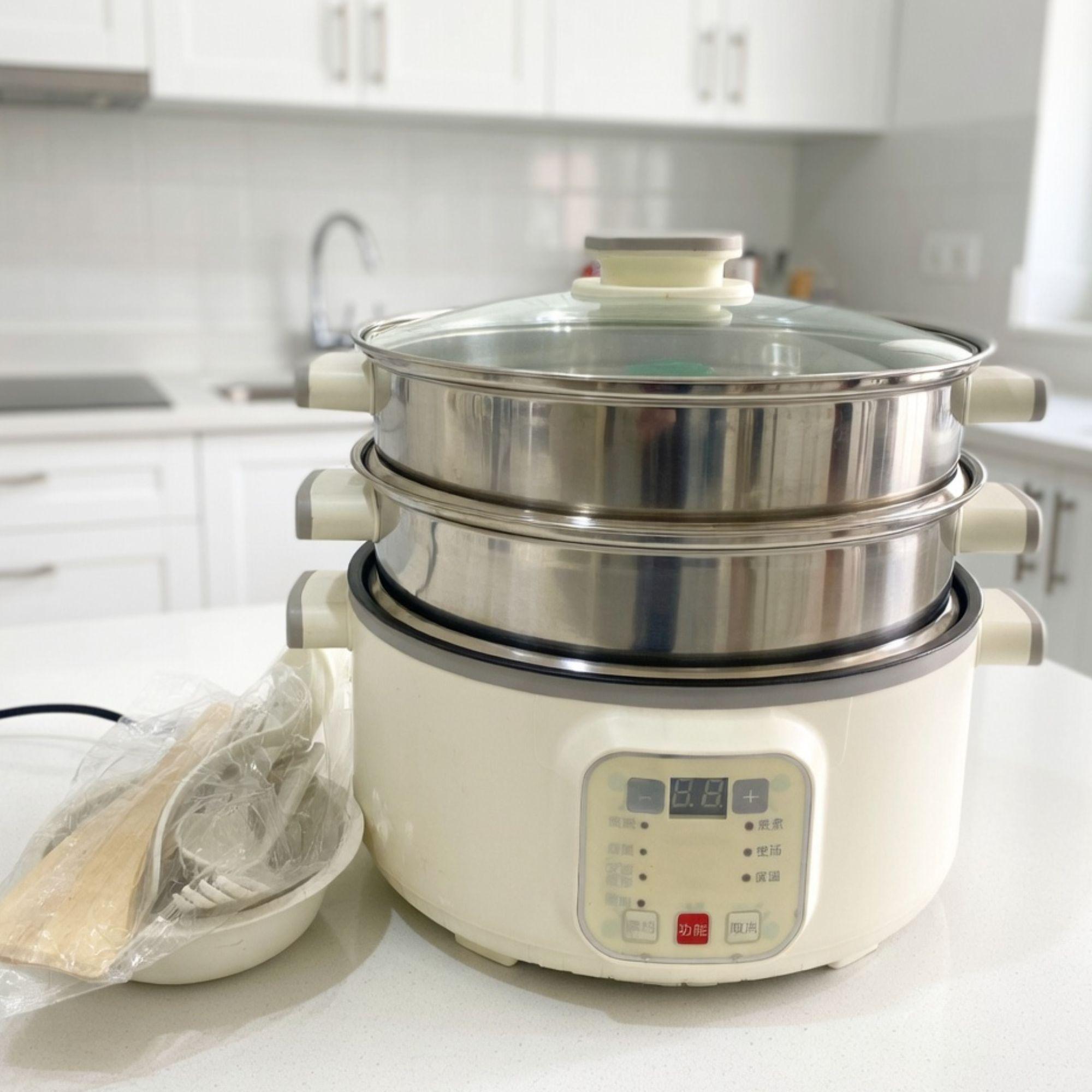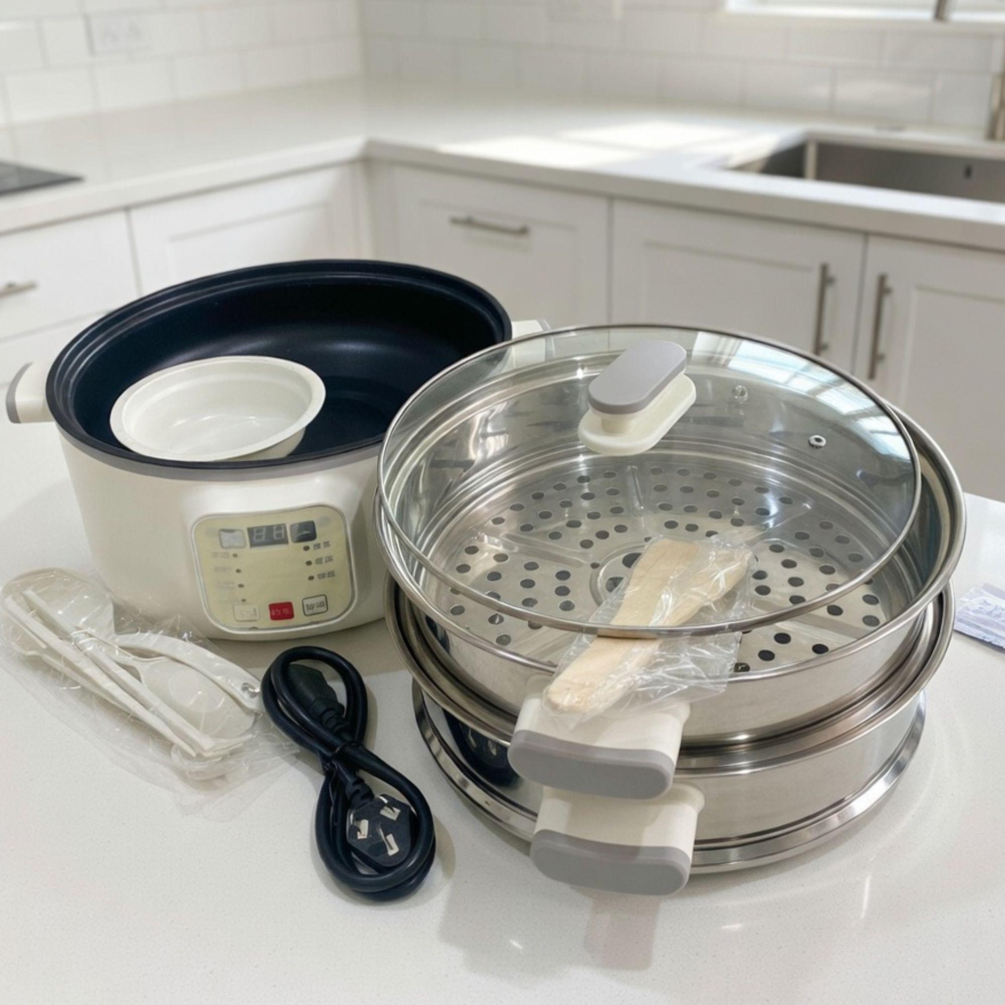 Modern kitchen efficiency is redefined by this versatile electric steamer that streamlines healthy meal preparation for busy households. Crafted with a premium non-stick inner pot, the base unit handles stir-frys, soups, and stews without the frustration of food adhering to the surface. Dual stainless steel steaming compartments sit securely atop the heating element, utilizing rising vapor to cook nutrient-dense meals with zero added oils. An intuitive digital interface features dedicated pre-set functions for rice, porridge, and steaming, removing the guesswork from your daily routine. Ventilated side handles are engineered to stay cool to the touch, facilitating safe transport from the countertop to the dining area. Compact proportions make it ideal for small apartments or dorm rooms while providing enough capacity for family-sized portions. Cleanup is remarkably fast due to the detachable modular components and easy-wipe interior finish. Whether you are a fitness enthusiast or a student, this appliance offers a reliable solution for fast, multi-layered, and healthy cooking.