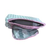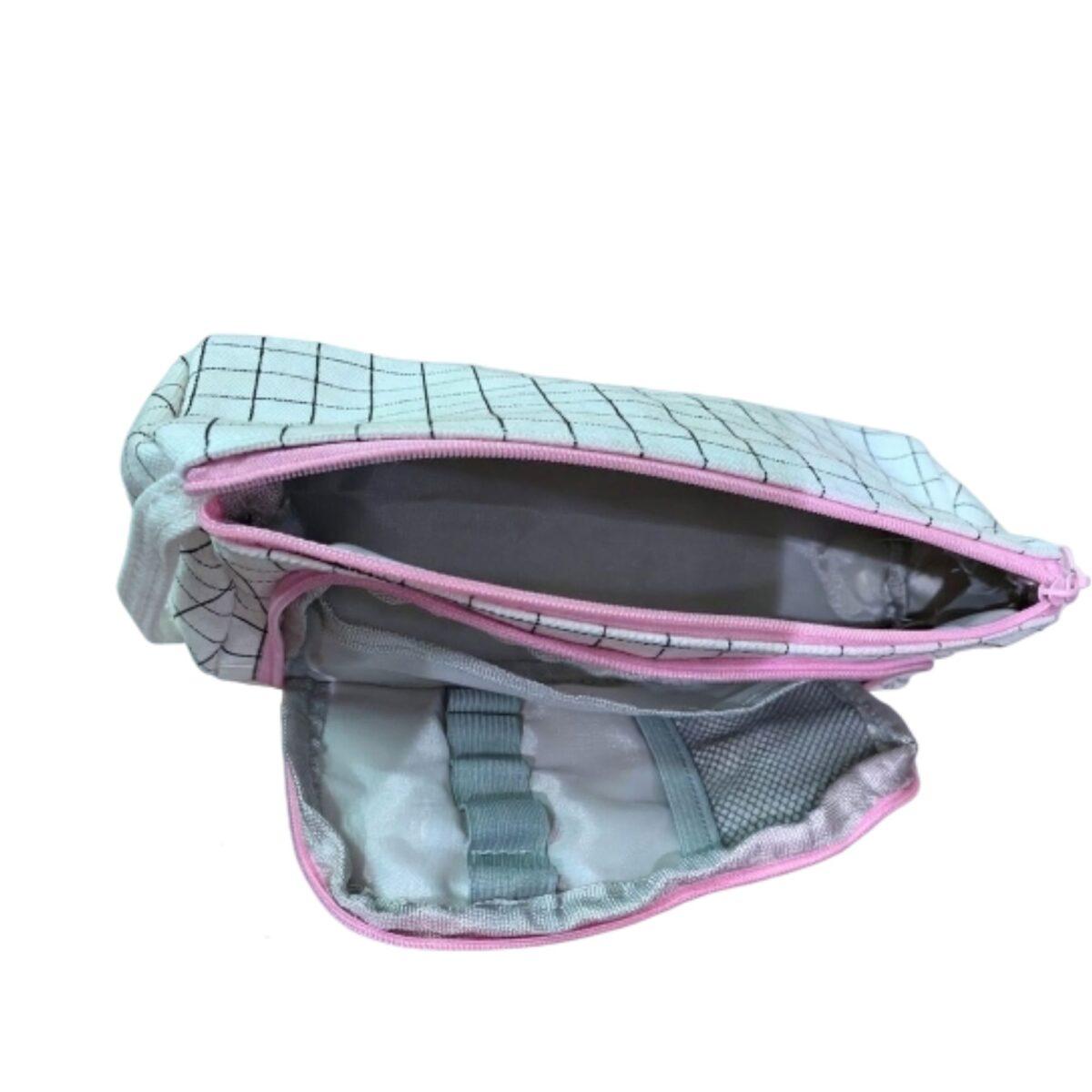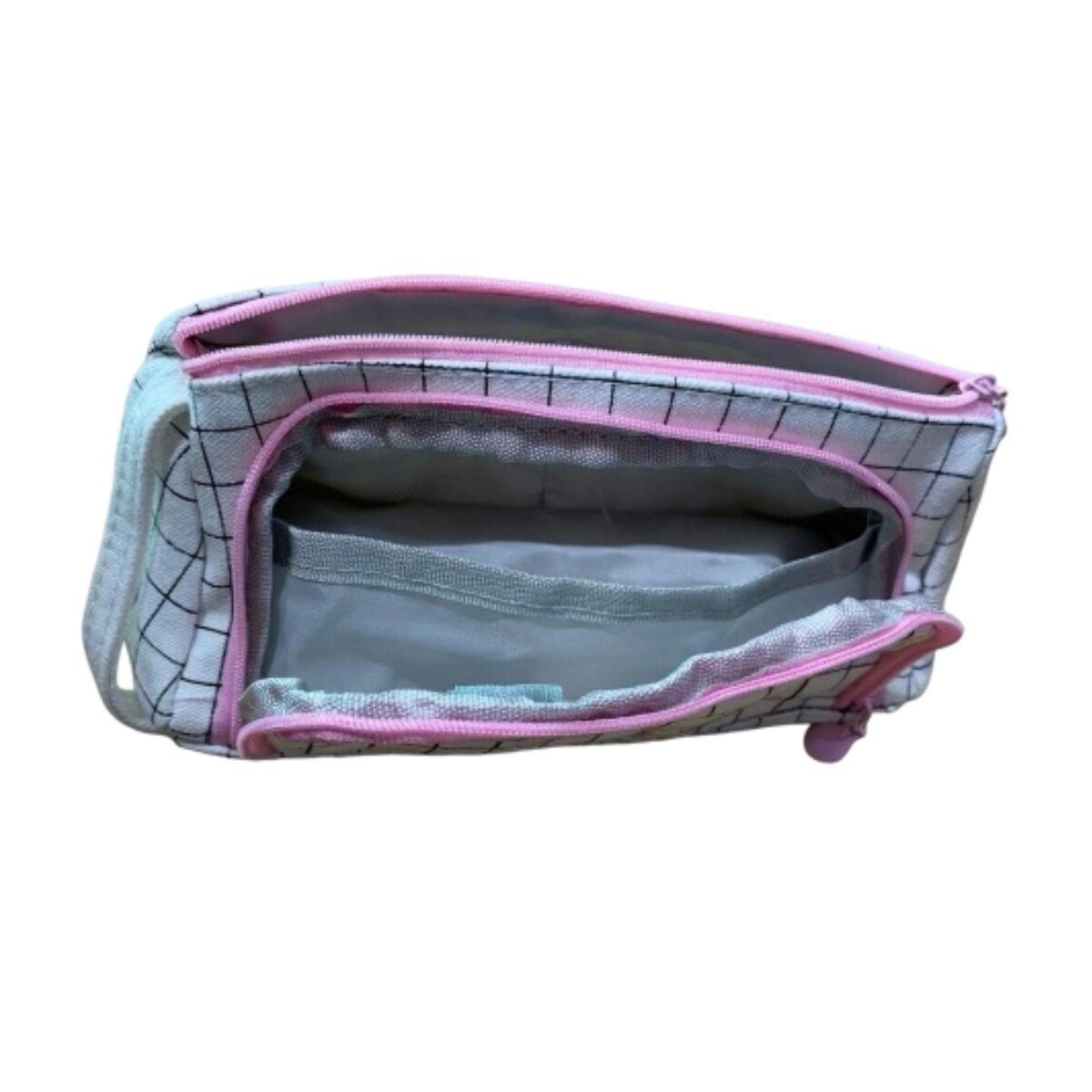 The case is crafted from high-quality, durable canvas with a timeless black-and-white grid pattern accented by soft pink zippers. Its standout feature is the multi-layered organization: