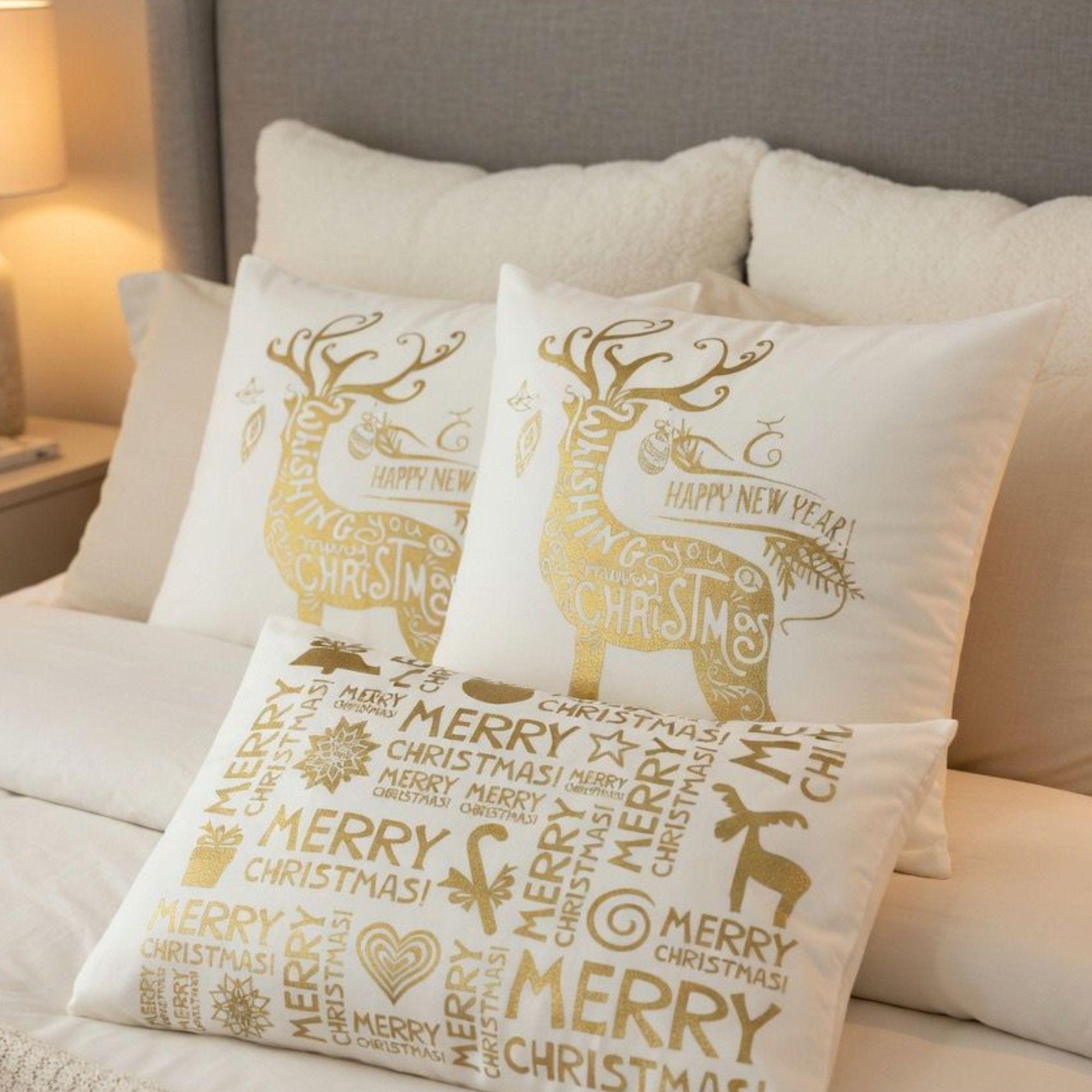 Seasonal charm finds a new expression in these luxurious metallic-print pillow covers that bring a touch of holiday magic to any room. Intricate gold foil detailing creates a radiant contrast against the crisp white fabric, making these accents stand out on sofas, beds, or armchairs. High-density microfiber material ensures a velvet-like softness that remains breathable and comfortable for everyday use. Every seam is reinforced for longevity, while the discreetly placed bottom zipper allows for quick insertion of your favorite cushion pads. These covers are specifically engineered to resist fading and pilling, maintaining their festive brilliance through many winters to come. Combining traditional holiday imagery with a contemporary metallic finish allows these pieces to complement both classic and modern interior styles. Cleaning is simple due to the stain-resistant nature of the fabric, ensuring your home stays camera-ready for every holiday gathering.